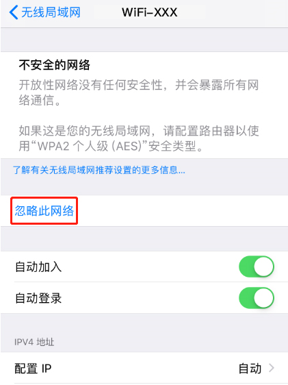 点击“忽略此网络”按钮,然后重新再关联该无线信号,此时可正常推送Portal下载界面